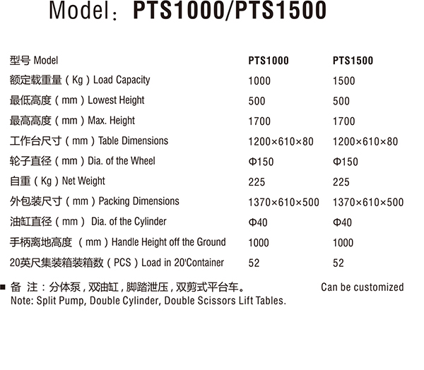 型号 | PTS1000 | PTS1500 |
